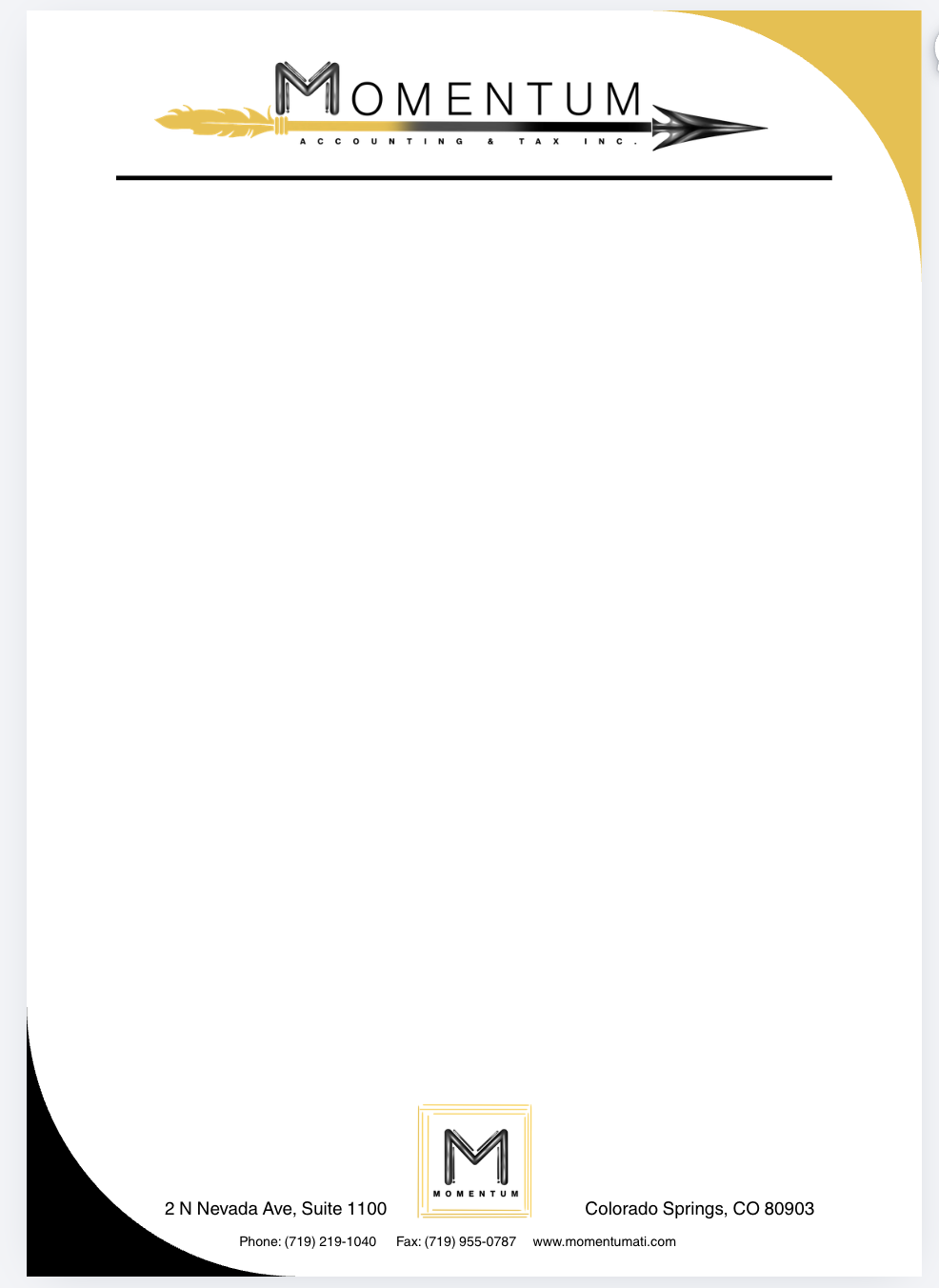 The website layout emphasizes clear structure and hierarchy, allowing clients to quickly locate services and key information without confusion. Supporting materials, including branded stationery and logo variations, were created to ensure consistency across all client-facing touch points, reinforcing the firm’s professionalism in both digital and formal communications. Together, these elements contribute to a cohesive visual presence that supports Momentum’s client relationships by quietly reinforcing confidence, reliability, and attention to detail.